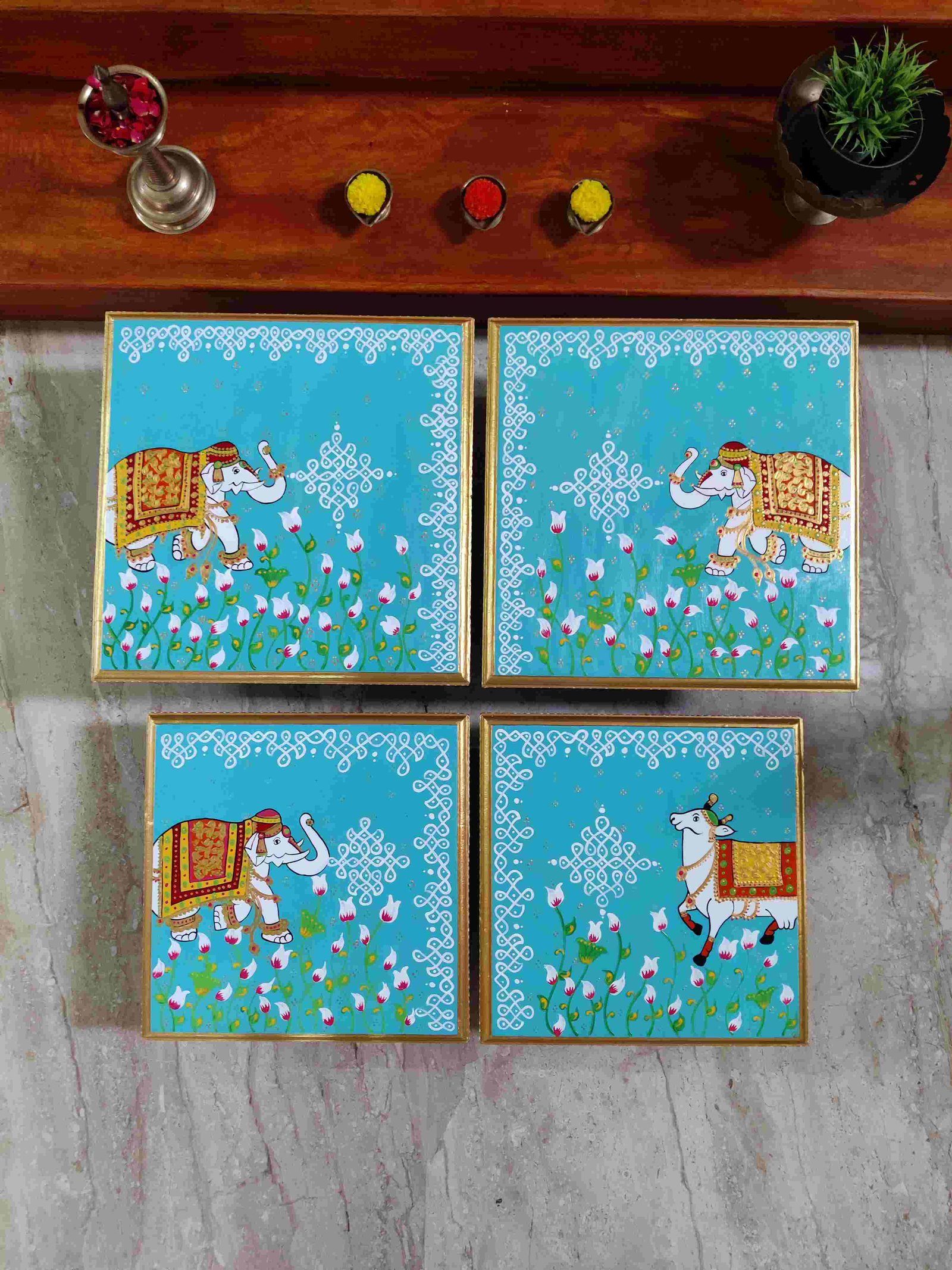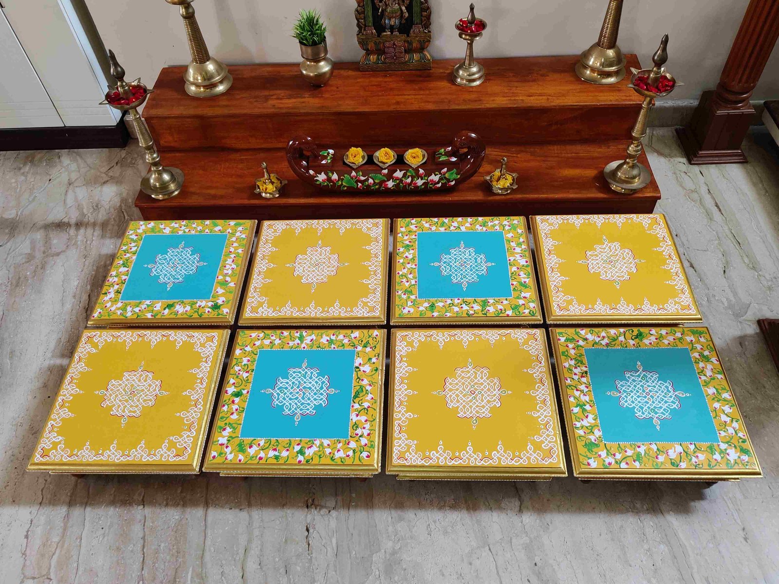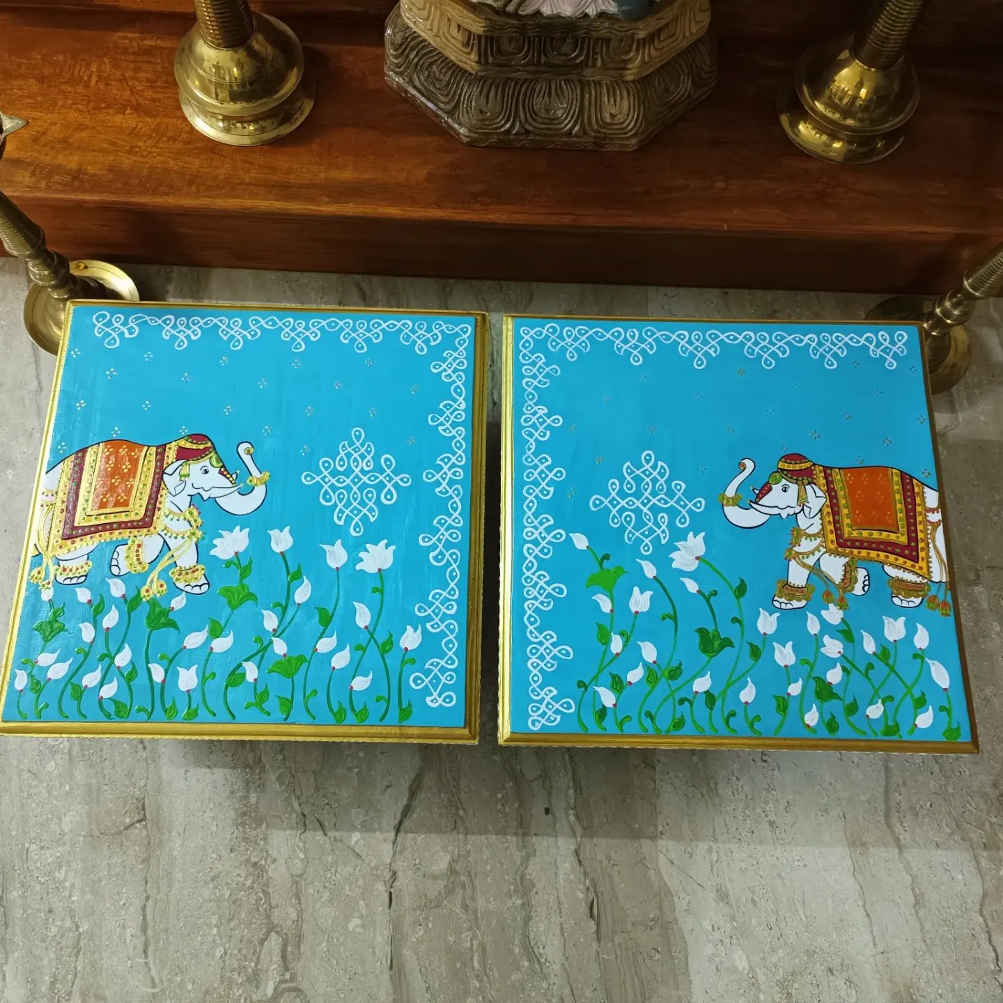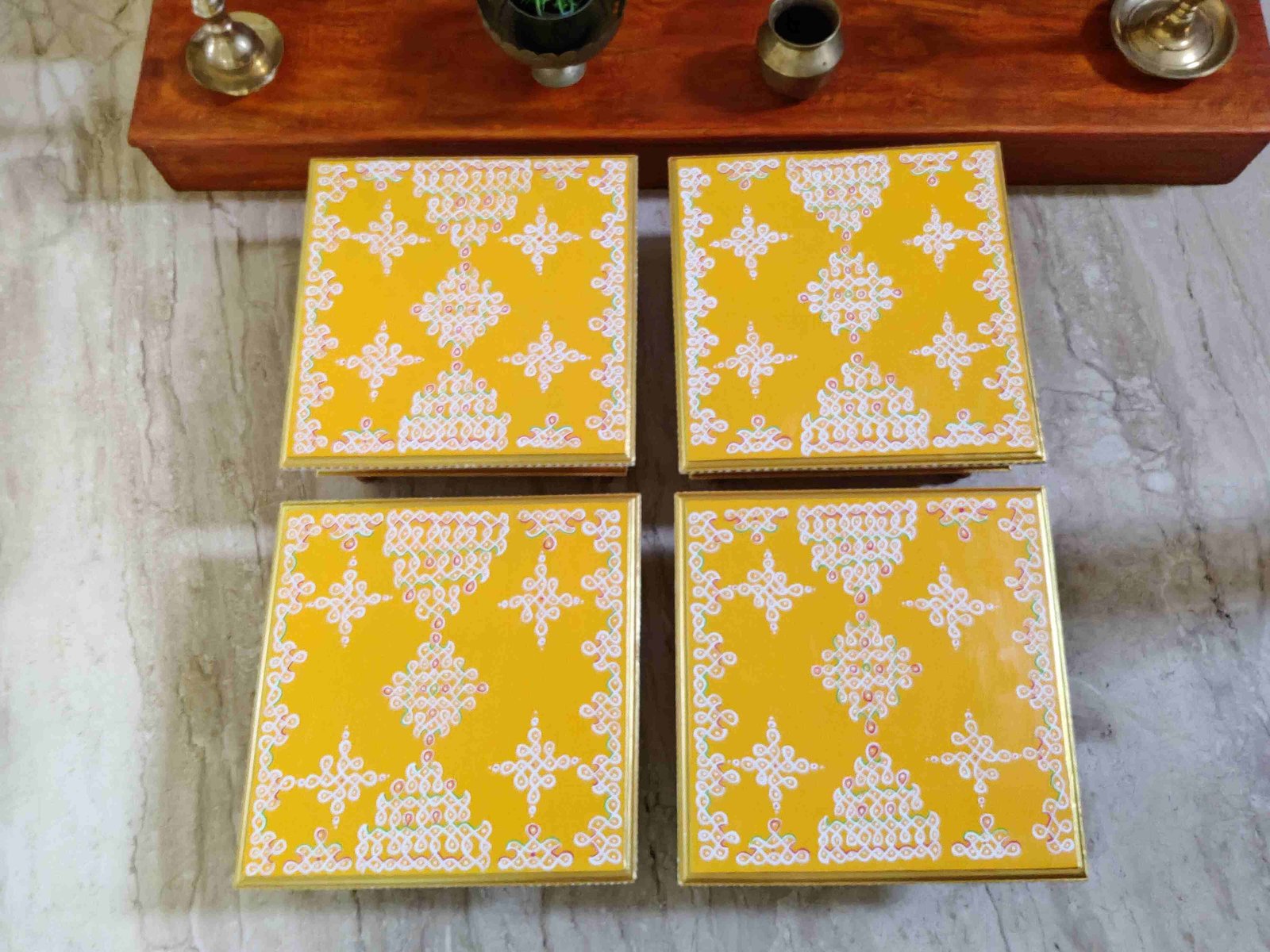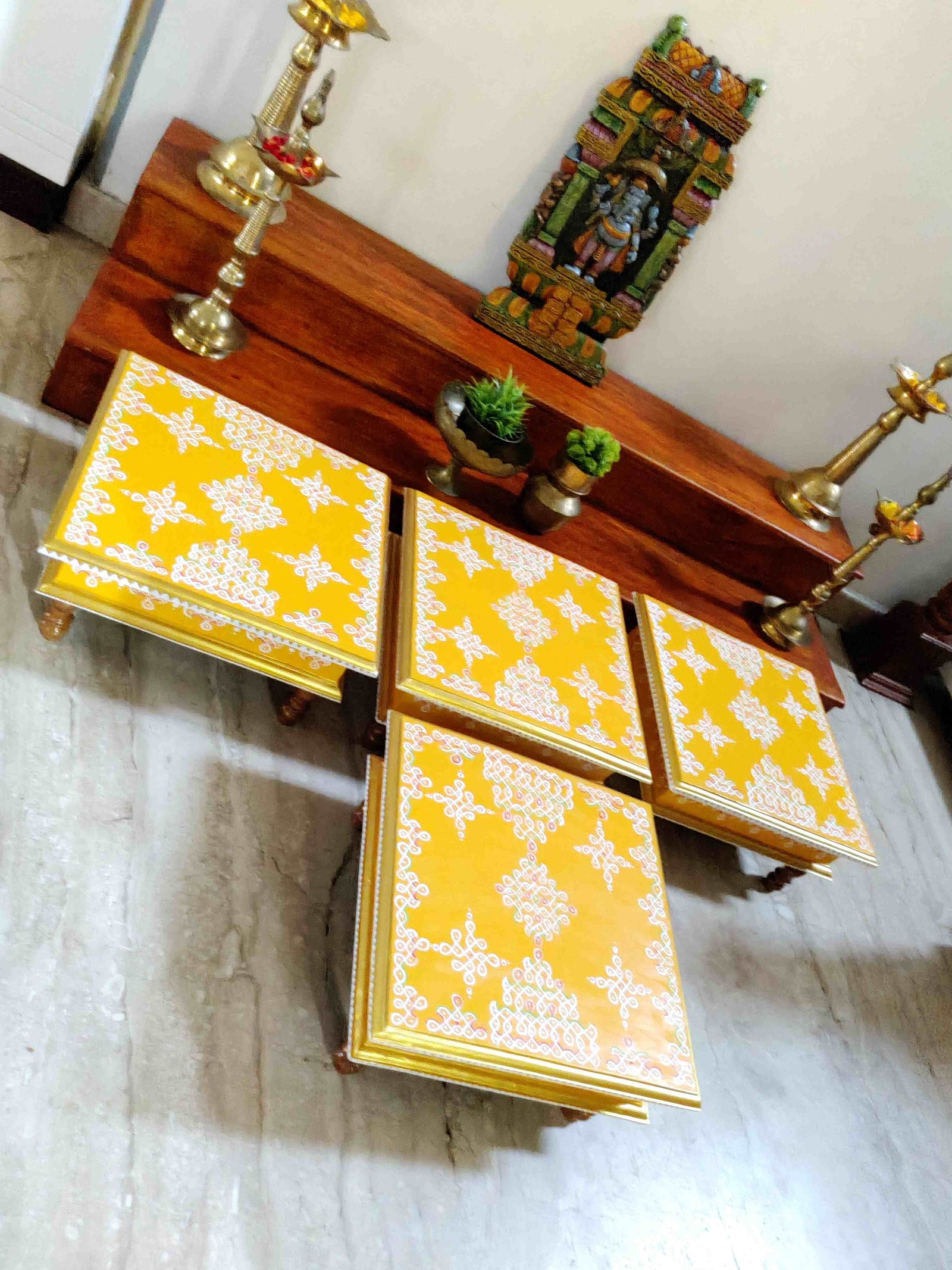 This is a traditional Square Style stools that have an increased height for sitting. This is the best option for those who need little raised stools for sitting. The best option for Display of Gods during Ganesh Chathurthi, Varalakshmi Pooja and Kalasams for Pooja. The bigger Size stools can be used as a side tables for Sofas / Couches. It can also be used as a traditional décor, display of heavy statues and other storage purposes. It can be done in wood finish only/ Painted