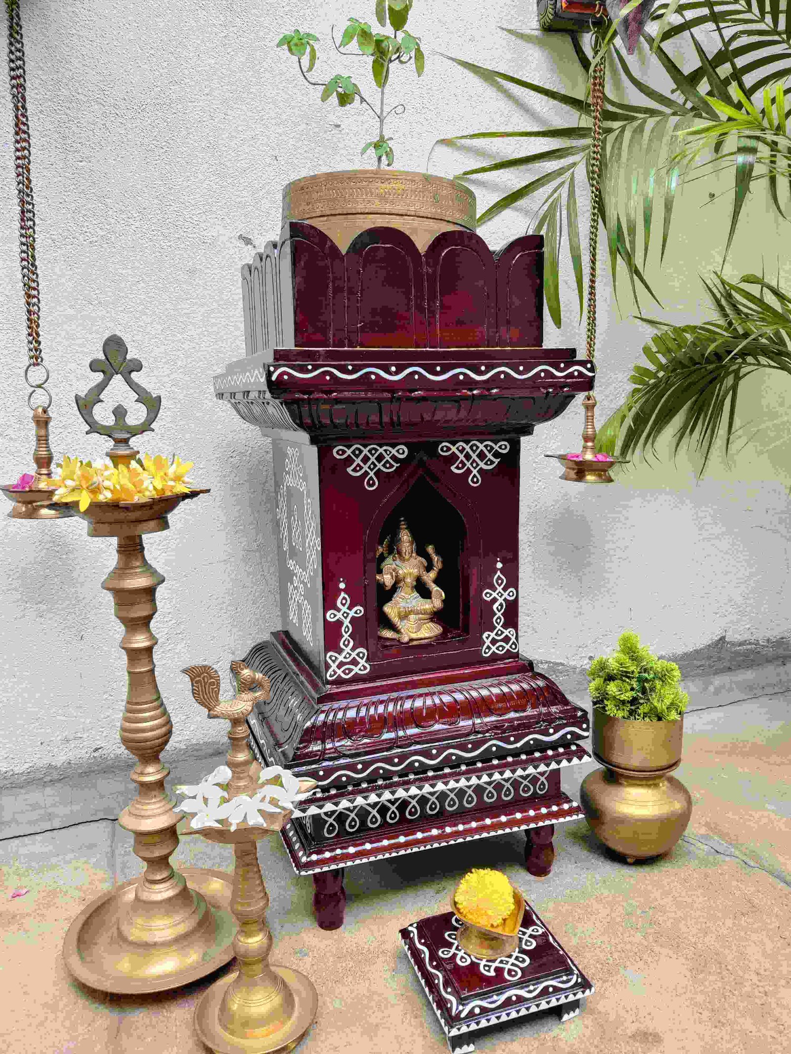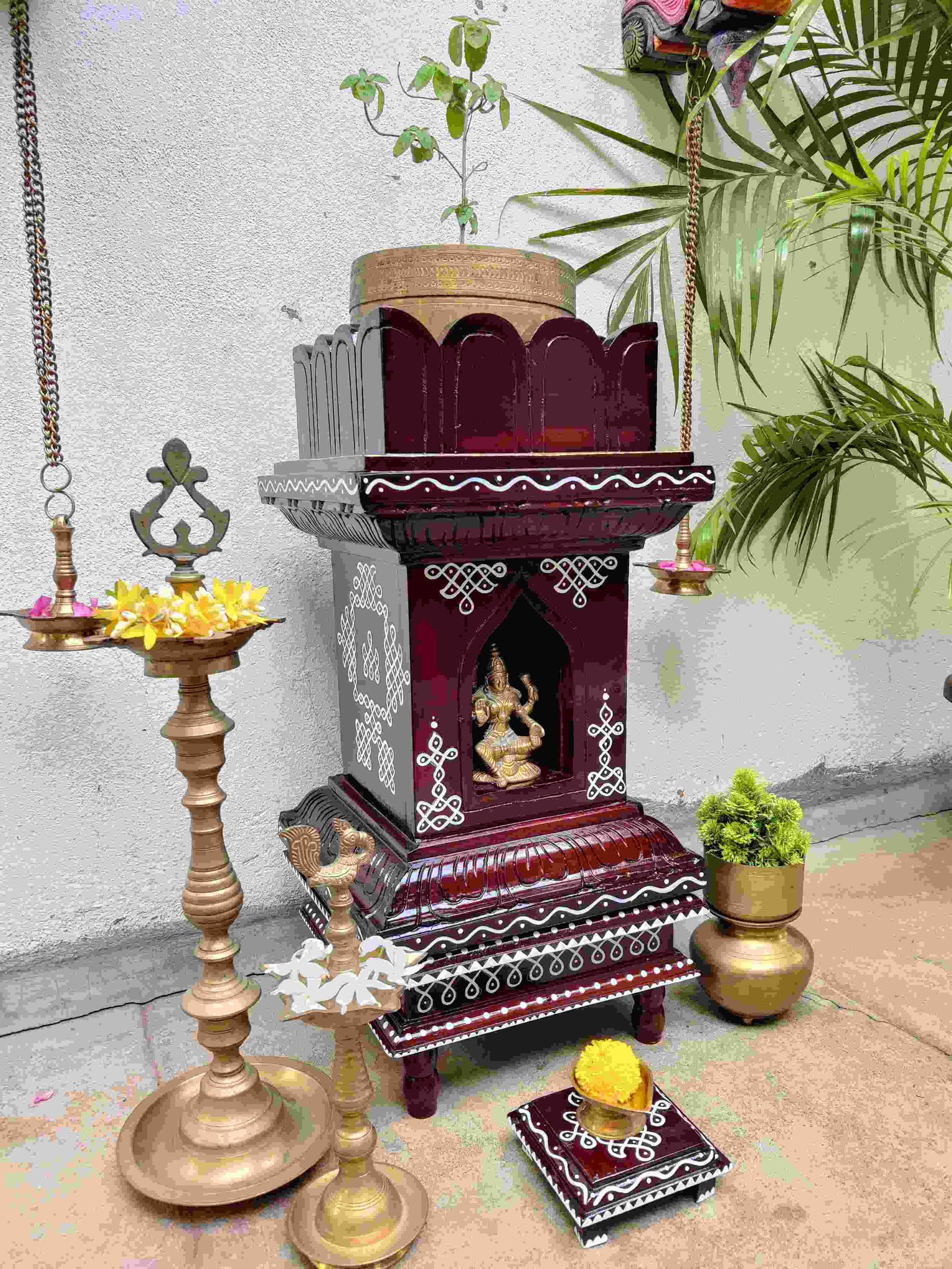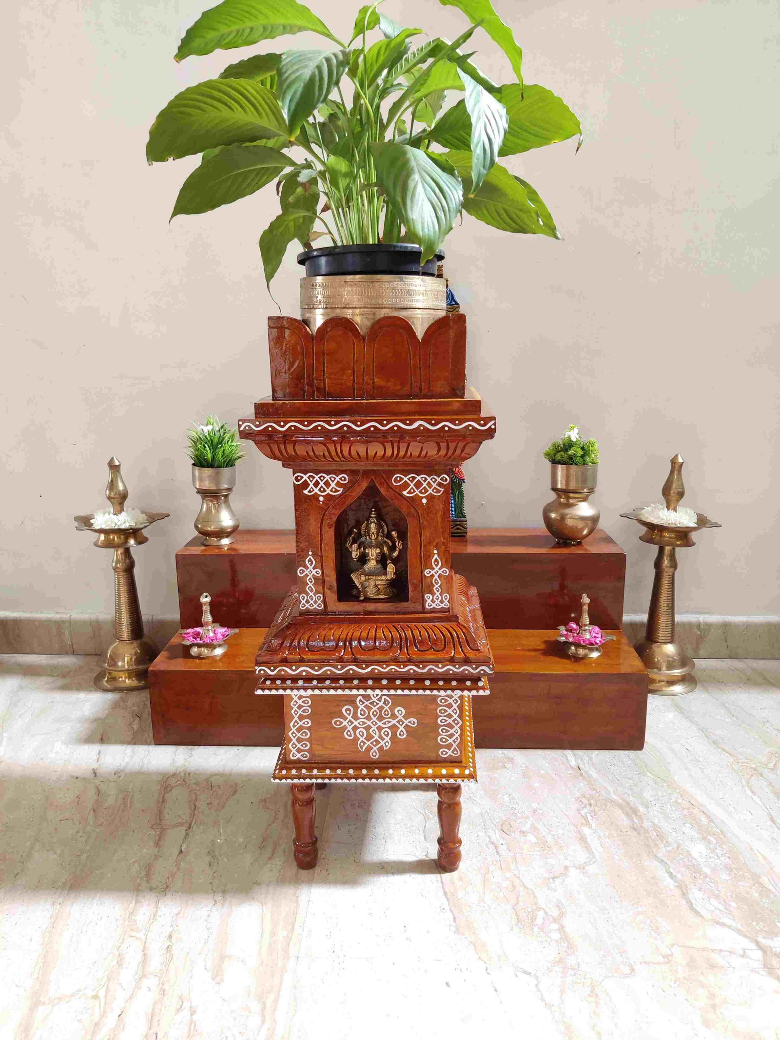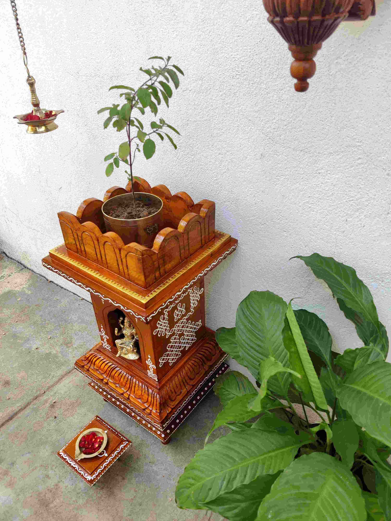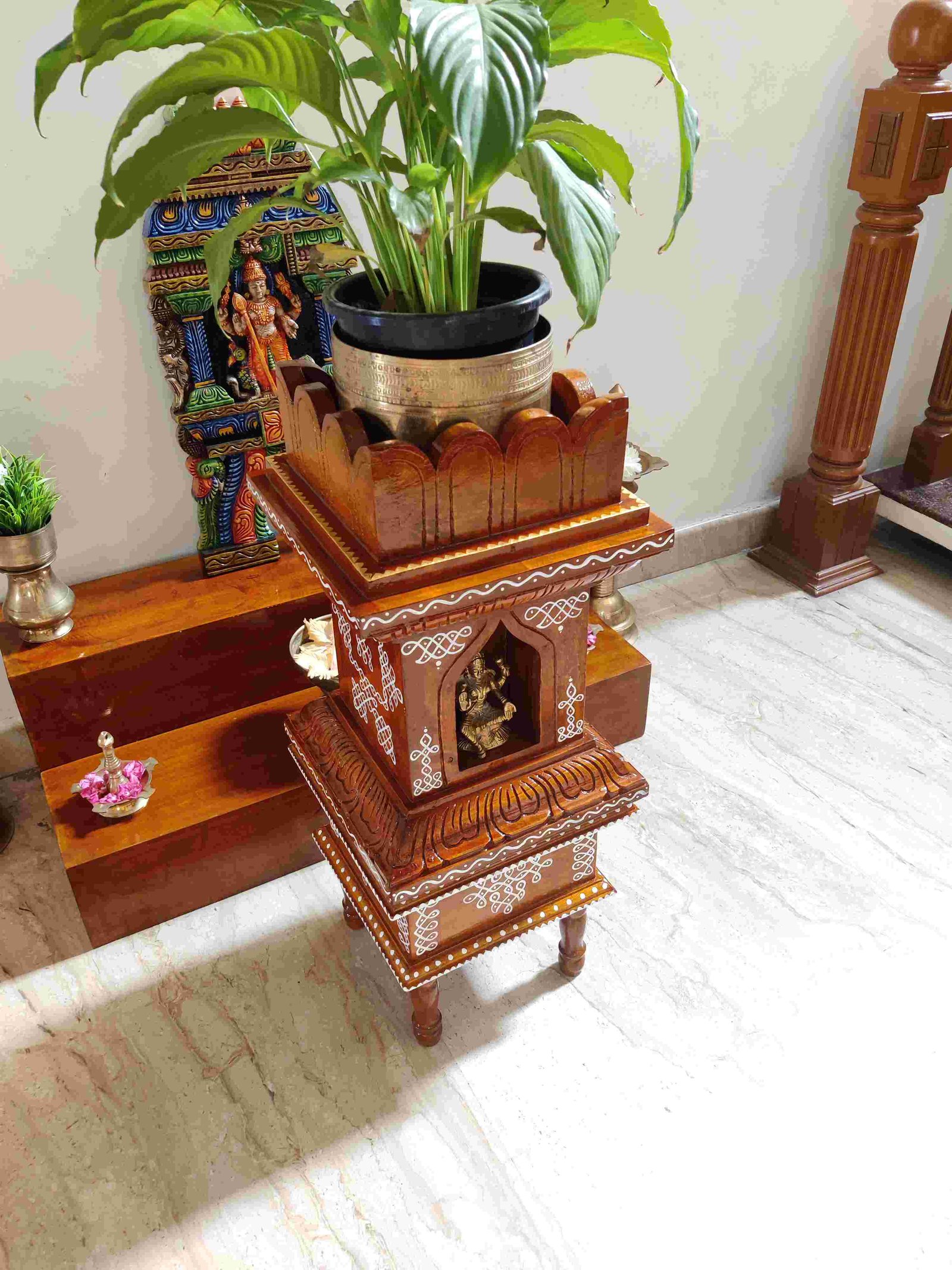 The wooden traditional Thulasi Maadam is an exquisite hand carved and handmade piece, This gives an antique look to your space. It can be also used as a display artifact with idols on it. If used for Thulasi plant, it has to be used as a planter only with proper protection at the bottom. Can be done in wood finish only. Paintings can be customized.
