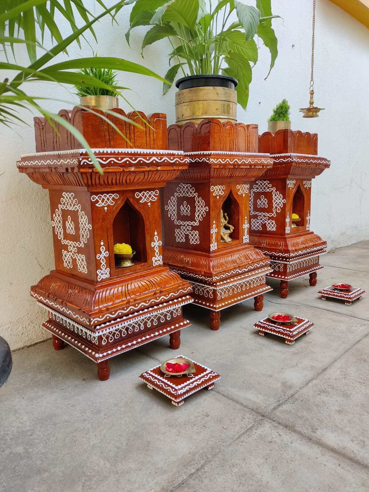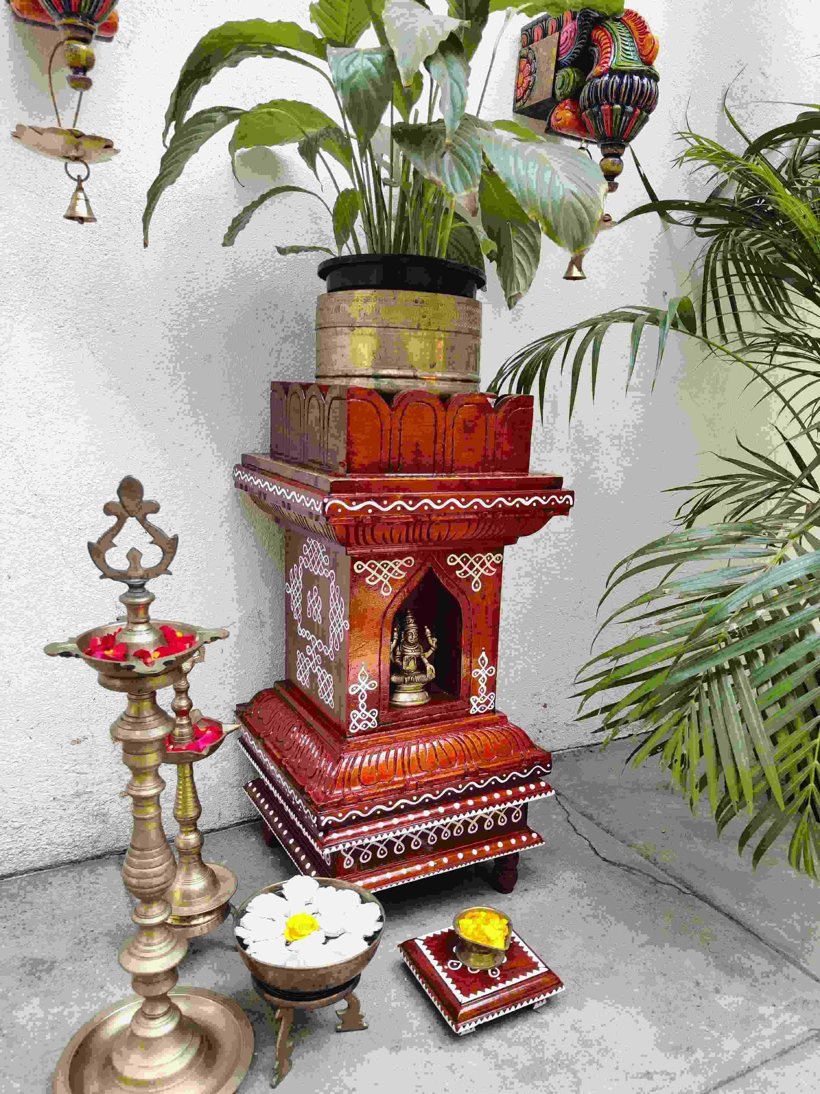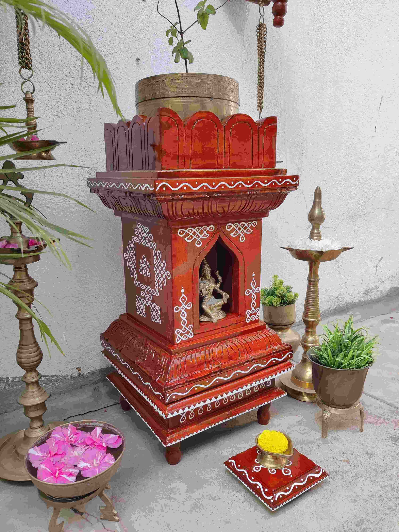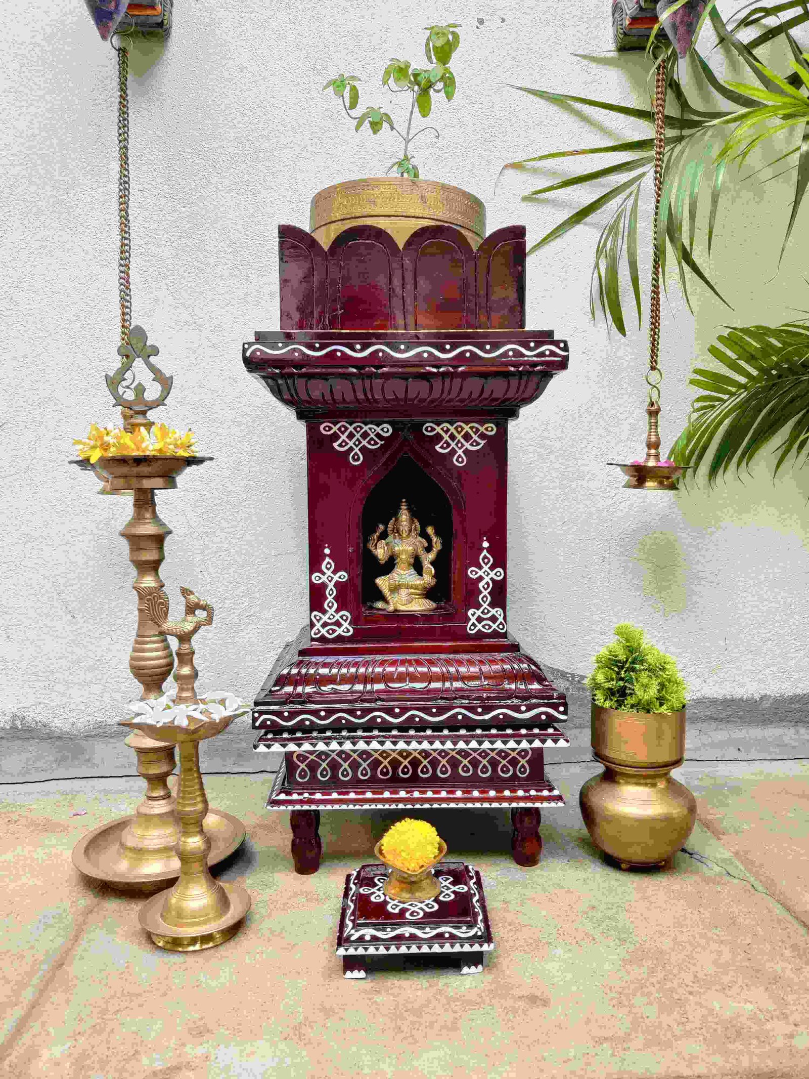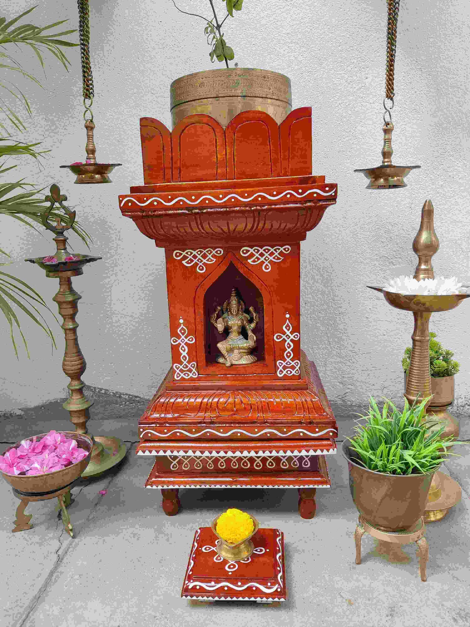 The wooden traditional Thulasi Maadam is an exquisite hand carved and handmade piece, This gives an antique look to your space. It can be also used as a display artifact with idols on it. If used for Thulasi plant, it has to be used as a planter only with proper protection at the bottom. Can be done in wood finish only. Paintings can be customized.