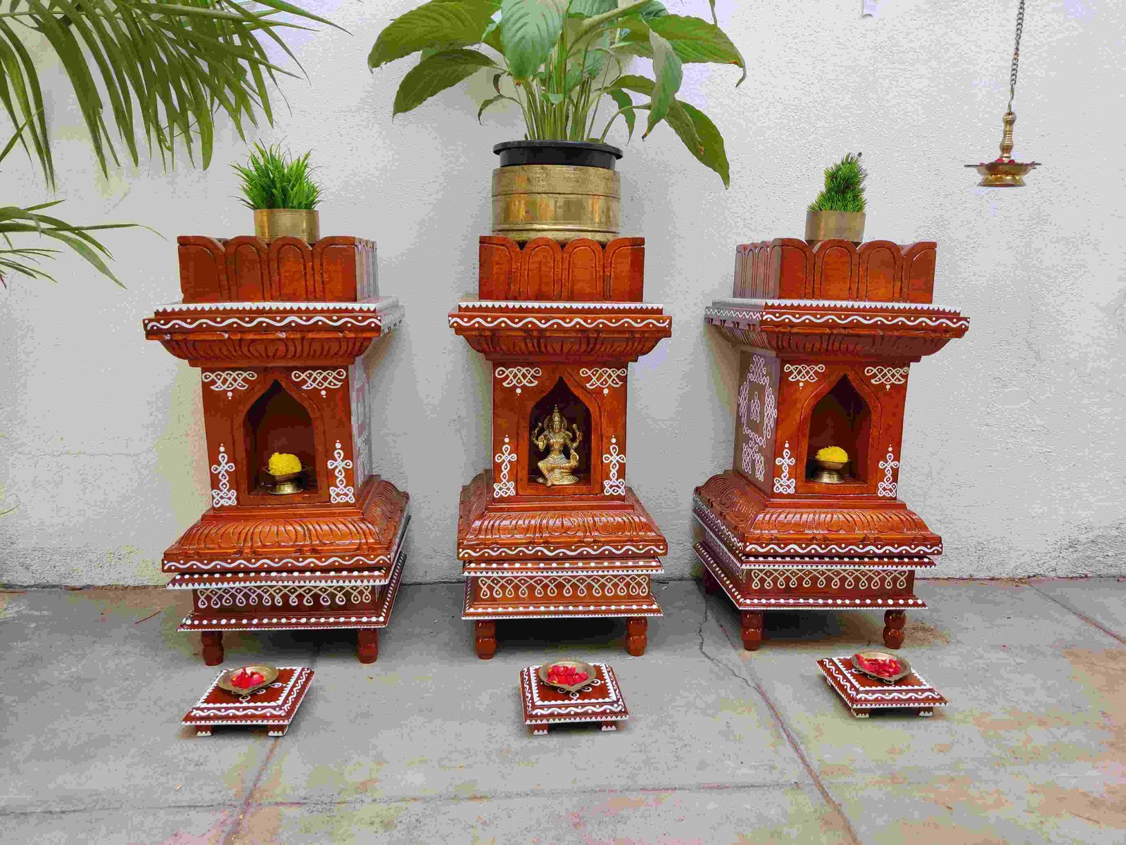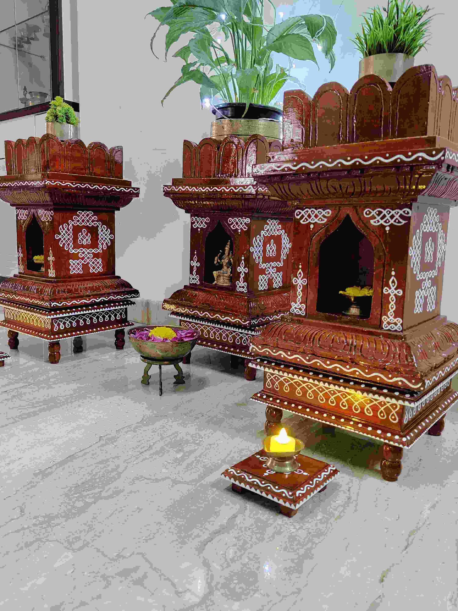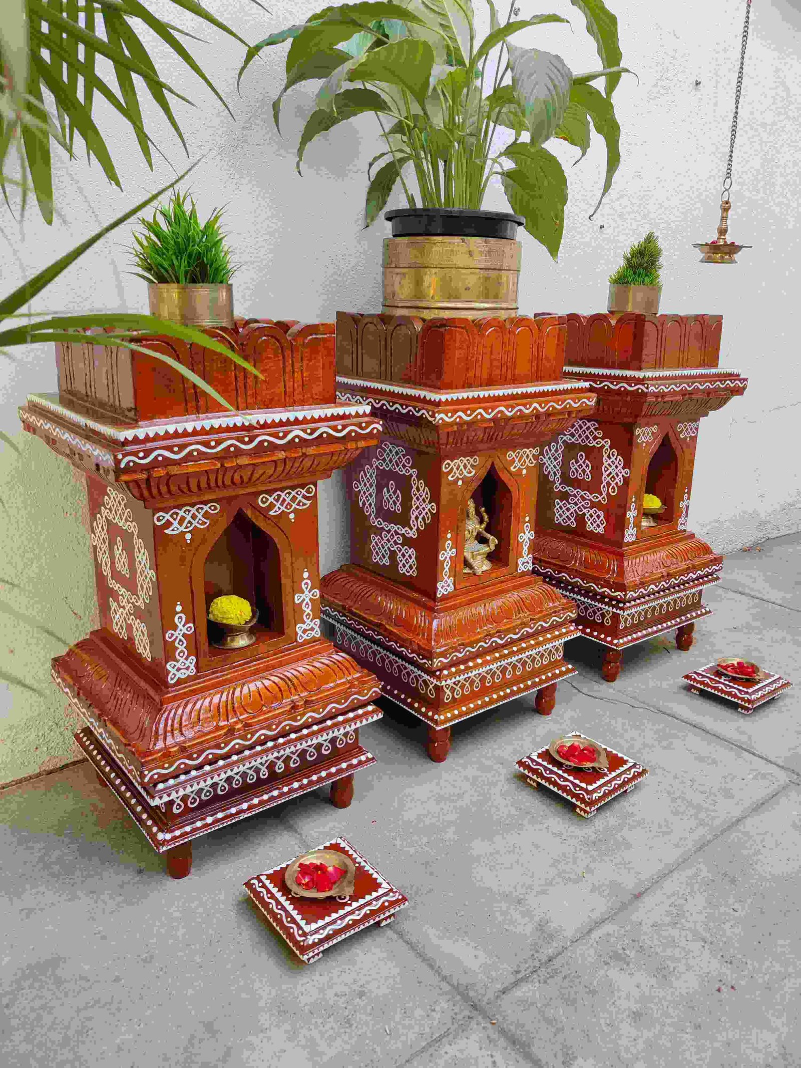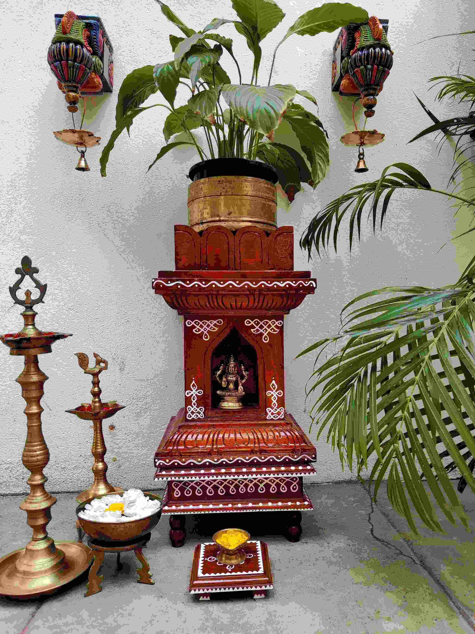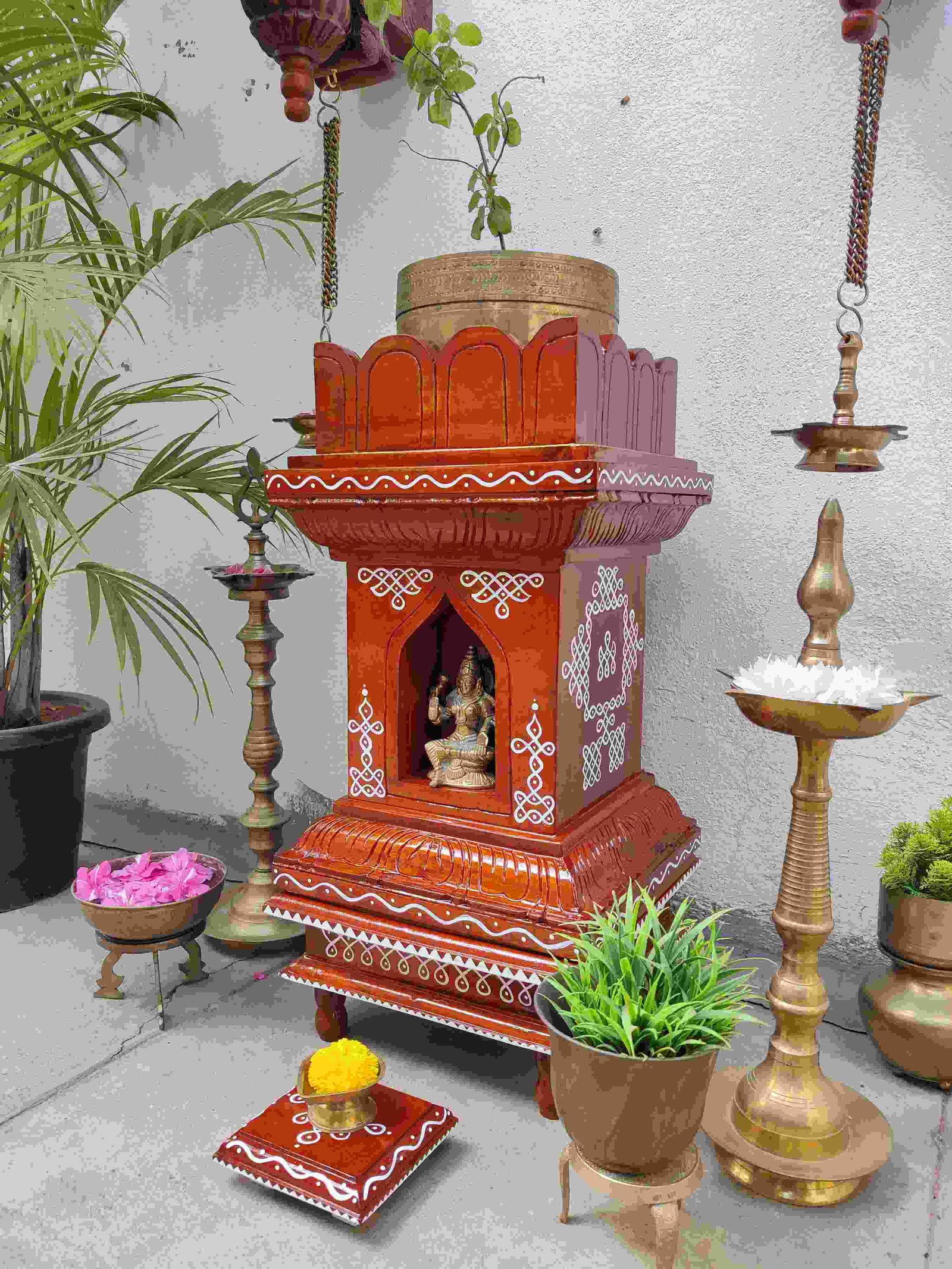 The wooden traditional Thulasi Maadam is an exquisite hand carved and handmade piece, This gives an antique look to your space. It can be also used as a display artifact with idols on it. If used for Thulasi plant, it has to be used as a planter only with proper protection at the bottom. Can be done in wood finish only. Paintings can be customized.