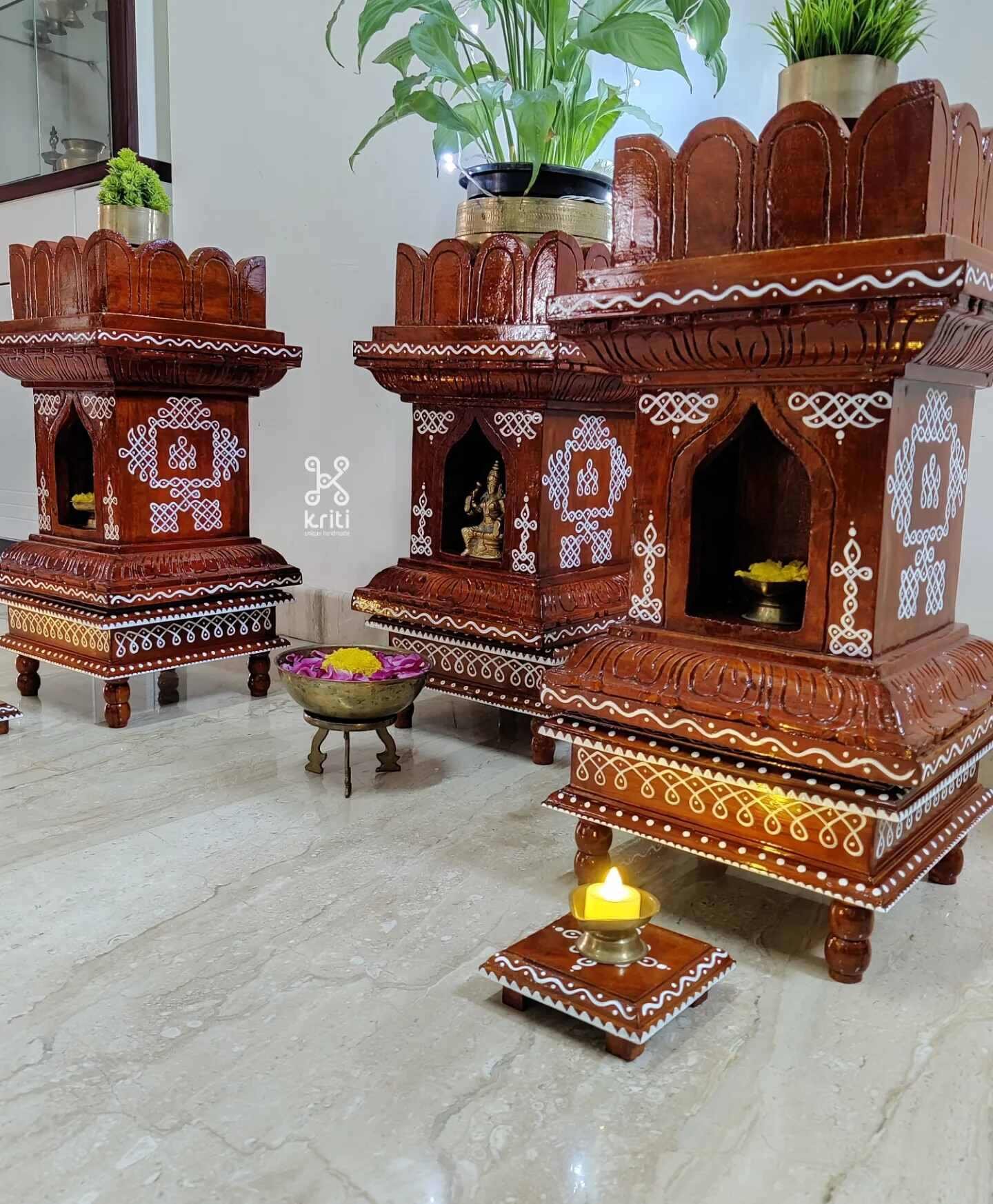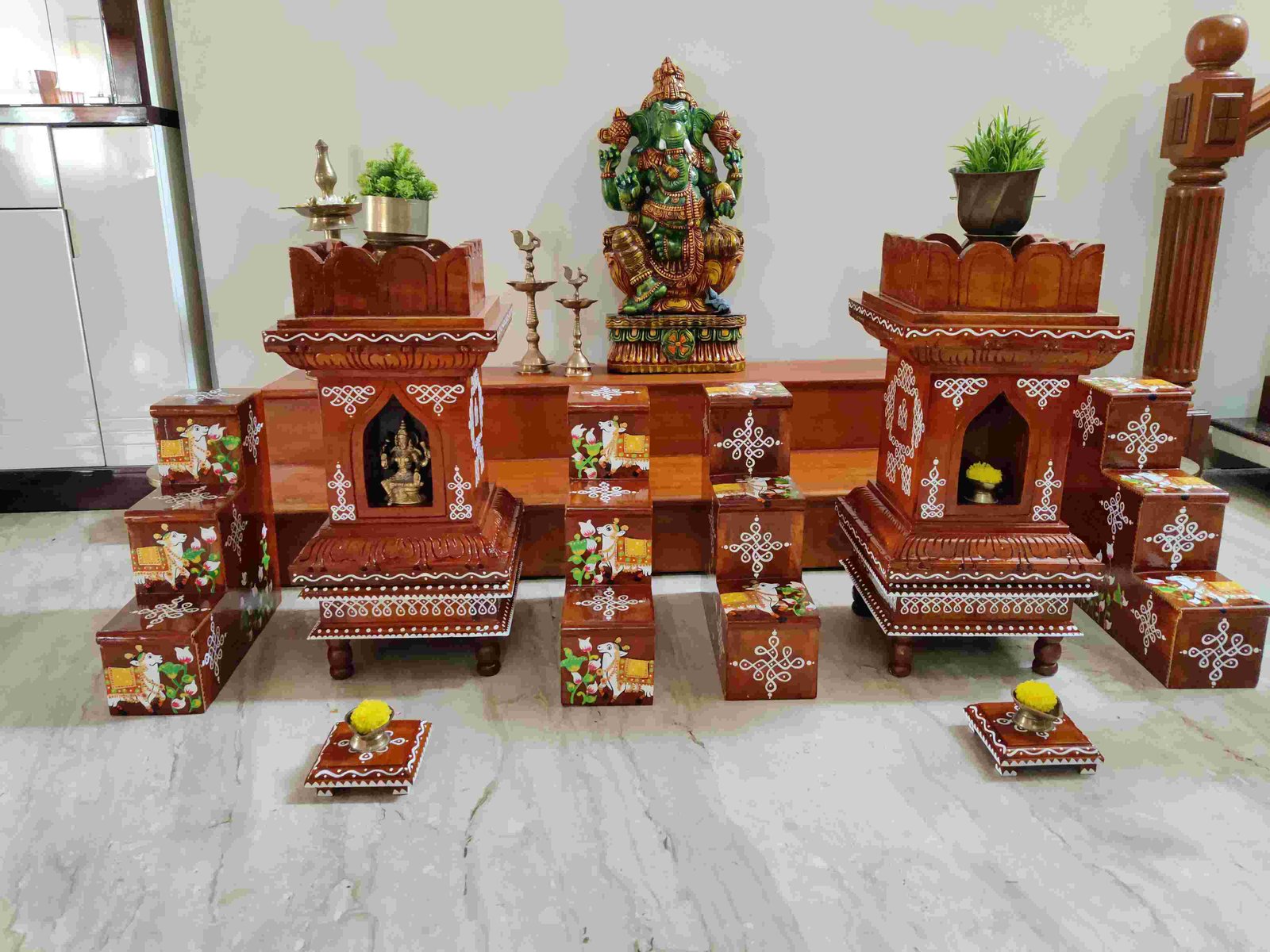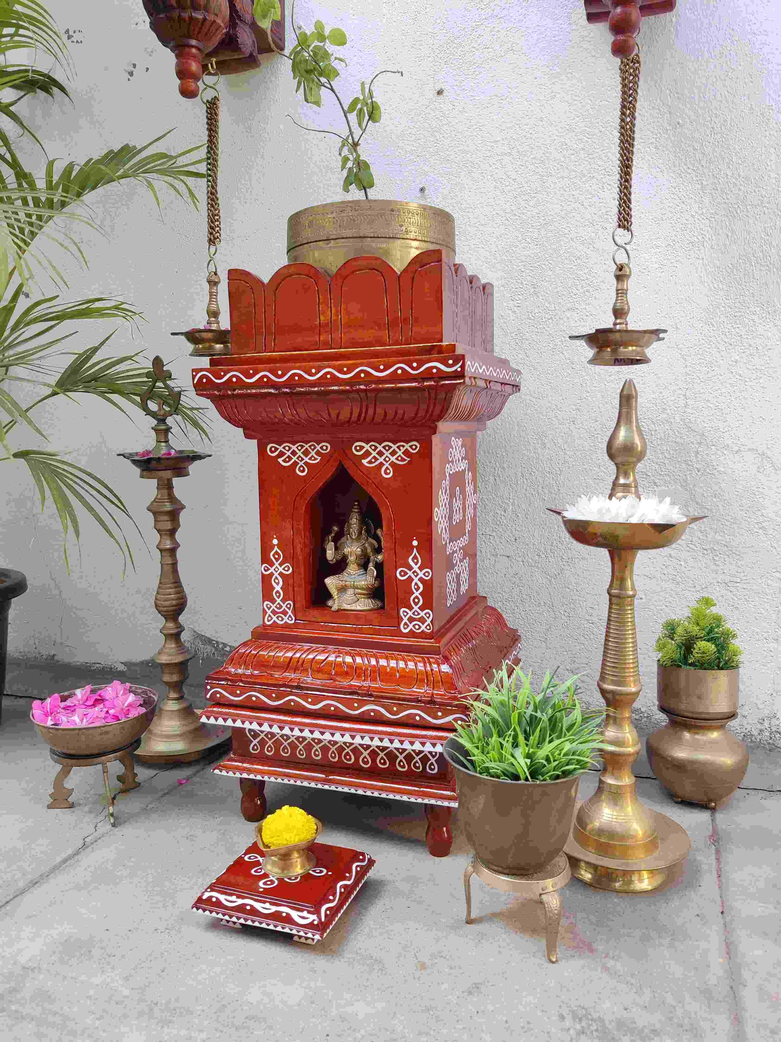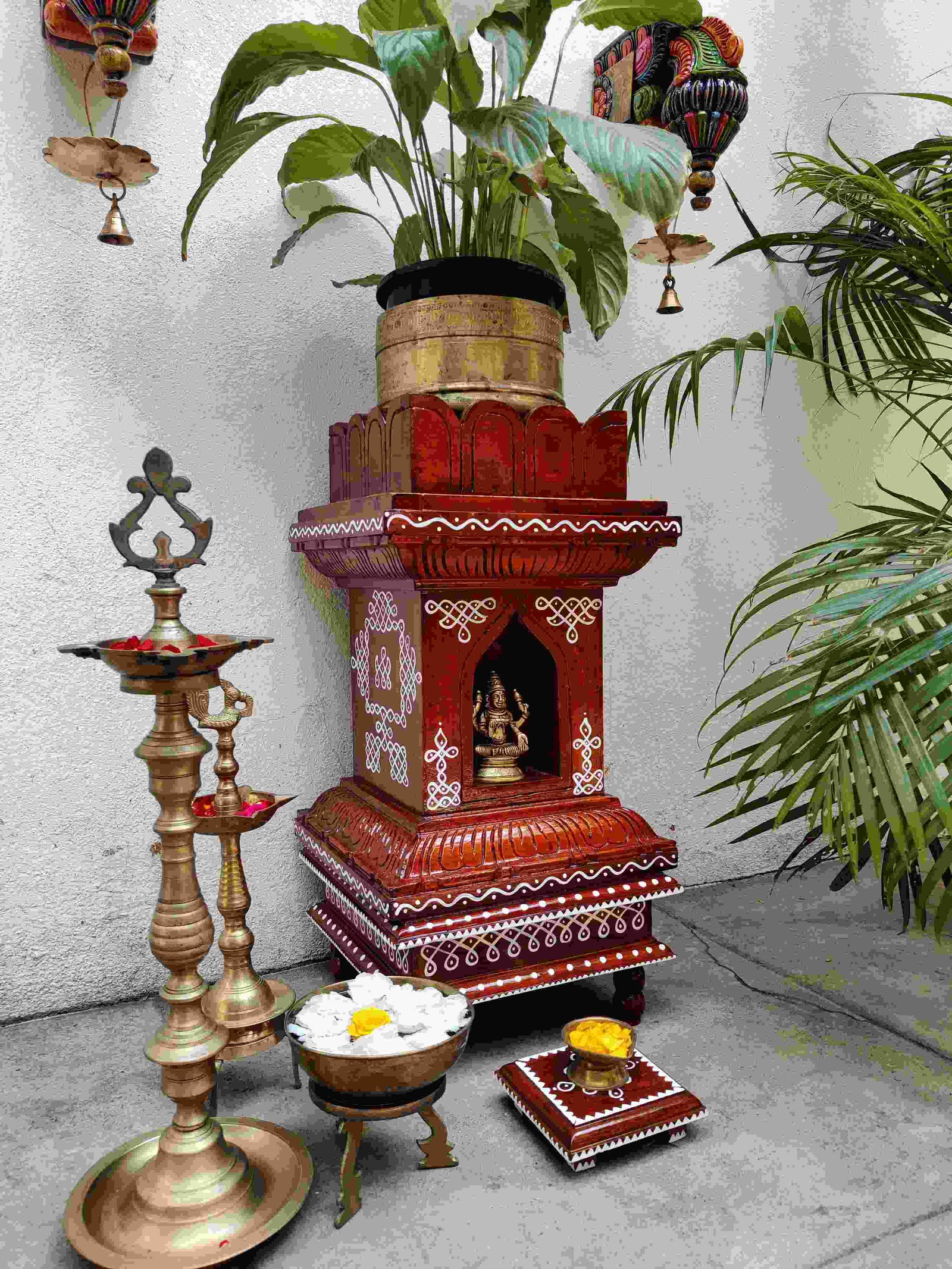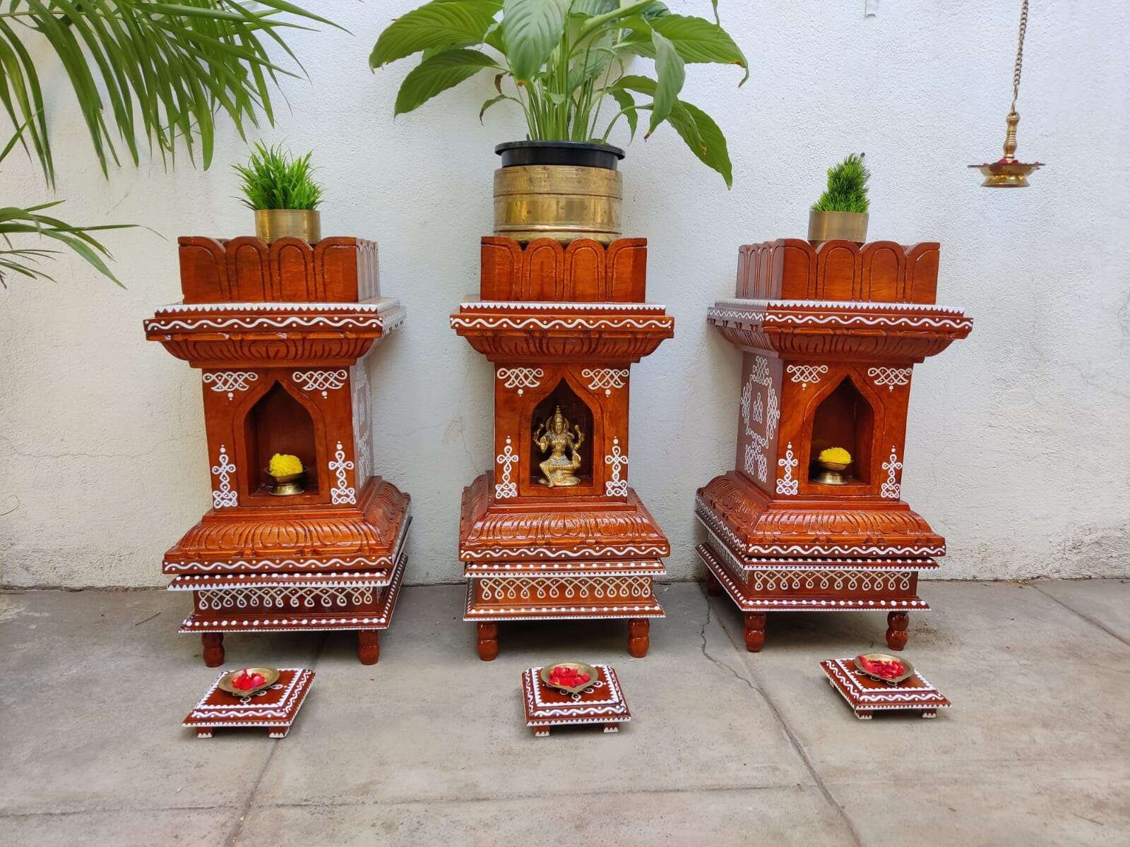 The wooden traditional Thulasi Maadam is an exquisite hand carved and handmade piece, This gives an antique look to your space. It can be also used as a display artifact with idols on it. If used for Thulasi plant, it has to be used as a planter only with proper protection at the bottom. Can be done in wood finish only. Paintings can be customized.